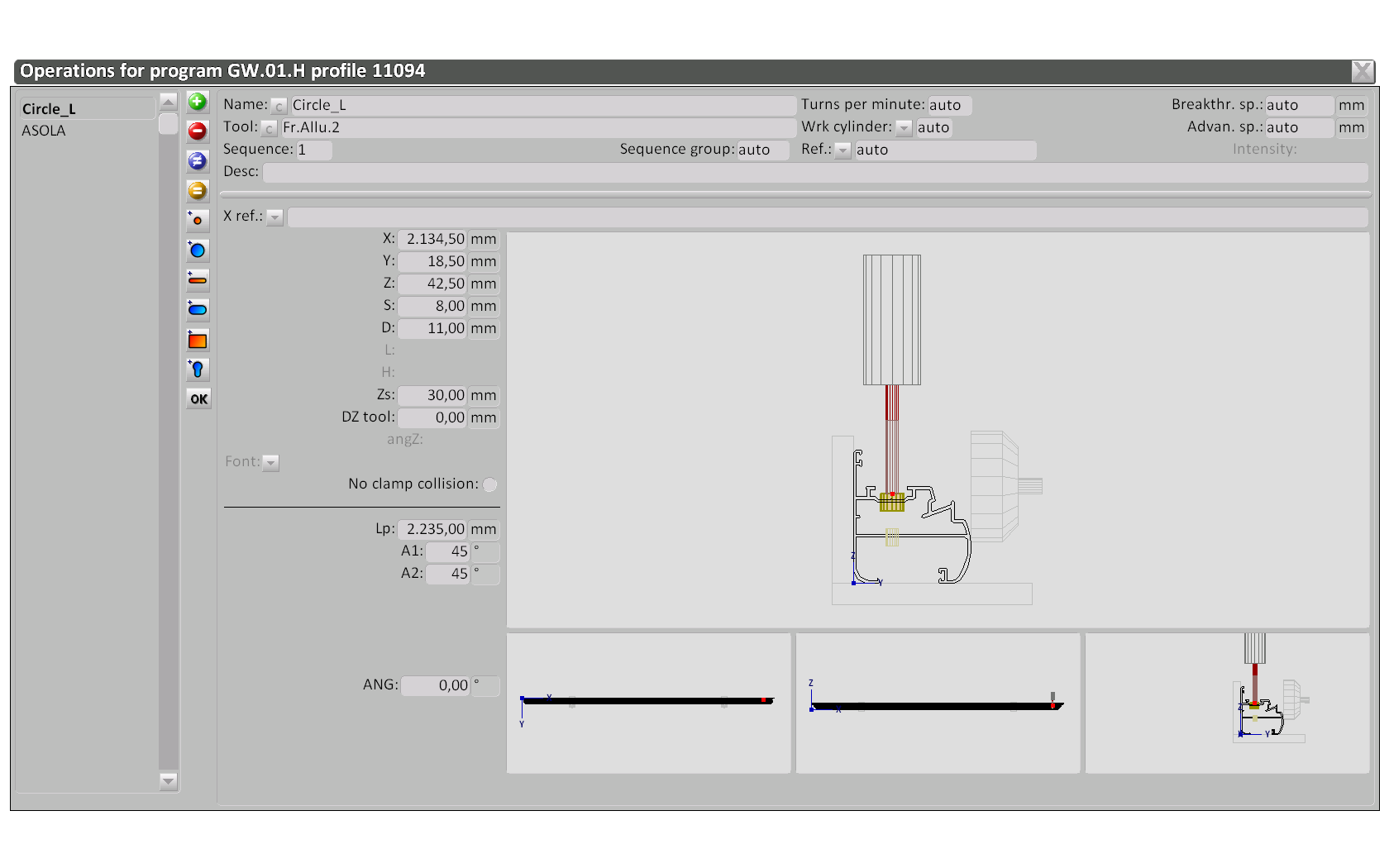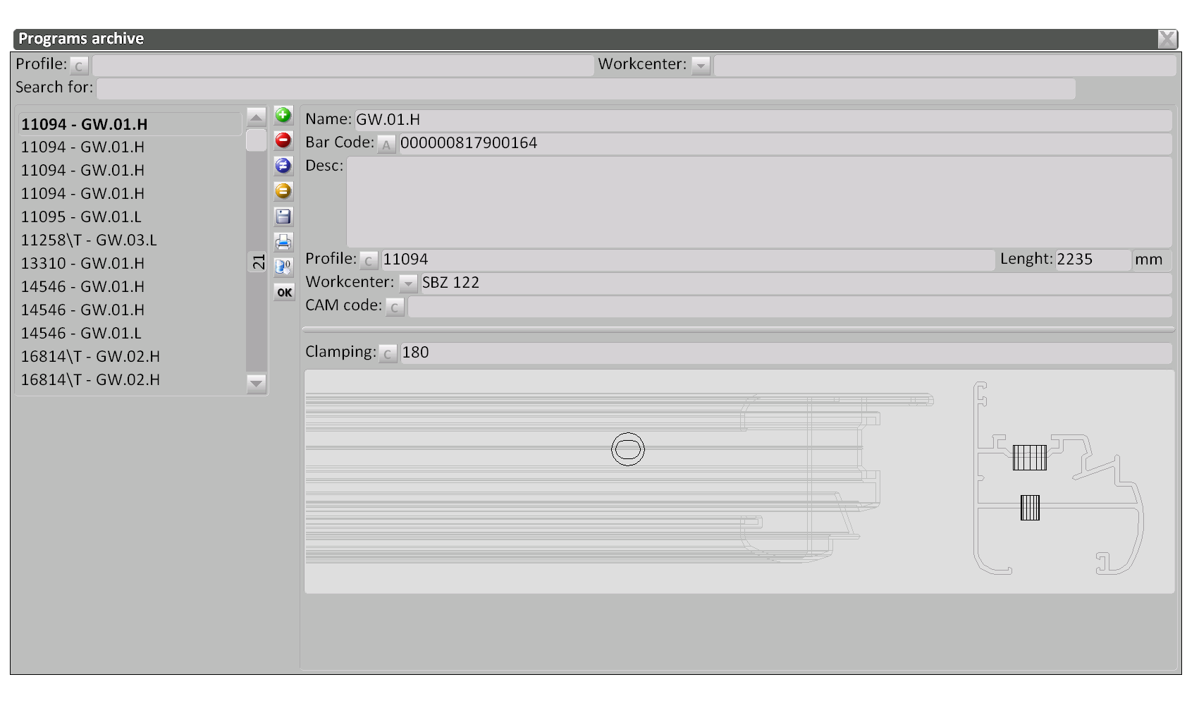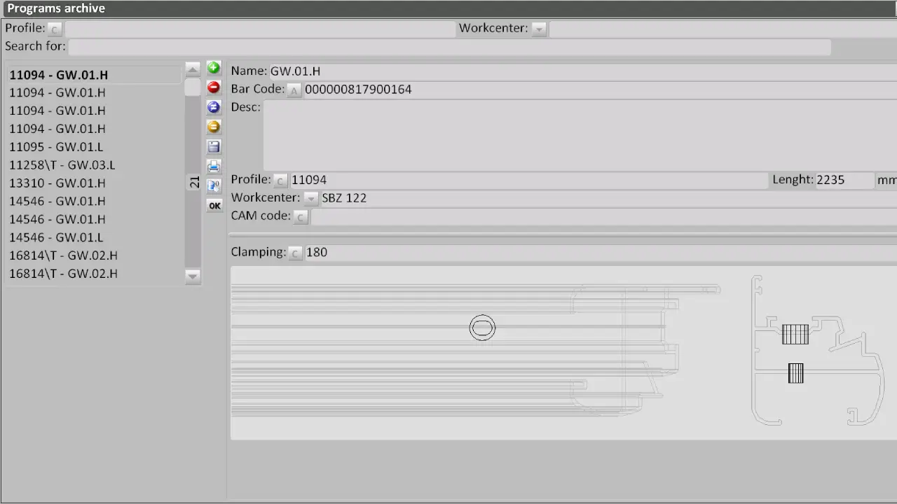 With Opera CAM we can preview the list of programs to be executed and check the one in execution; adjust the position of the clamps on the profile; check the position of the spindle for holes or slots; archive the tools and programs.